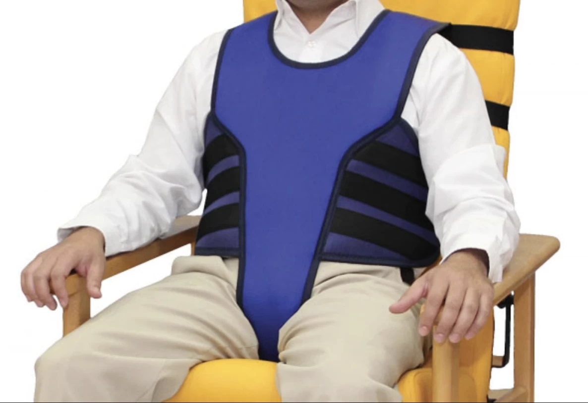 La sujeción se efectúa mediante 5 cintas con cierres clip de nylon que, partiendo del hombro y de la cintura, se abrochan en la parte posterior del asiento. Una vez abrochados se regula la longitud según la corpulencia del paciente y el perímetro de la silla.
